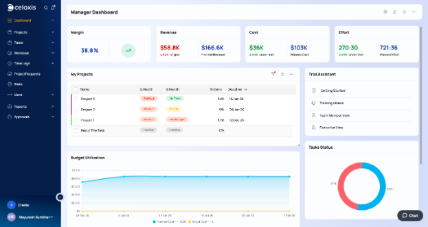 ↪ Celoxis works well for enterprises managing multiple concurrent projects. It combines resource planning with utilisation tracking and portfolio-level reporting. It integrates with Jira, Salesforce, Excel, QuickBooks, and Microsoft Project.